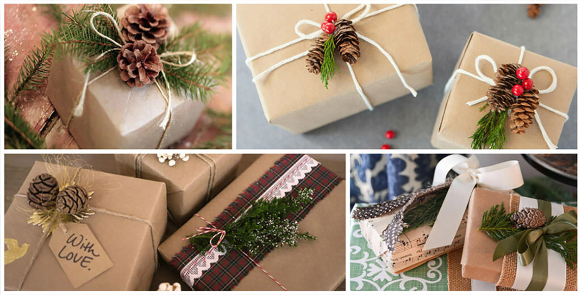 - Используйте крафт-бумагу с натуральными элементами (сухоцветы, веточки).